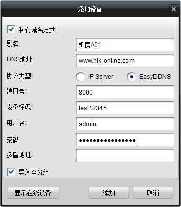 打開iVMS-4200客戶端軟件,進入“設備管理”界面添加設備。選擇私有域名方式添加,協議類型選擇成??礑DNS,填寫設備域名、用戶名、密碼,即可正常使用iVMS-4200客戶端軟件訪問設備。