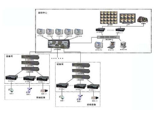 系統采用三級架構體系。各監控現場為第一級,此級主要是視頻源的采集,主要是攝像機、球機防護罩和支架等的安裝;網線和光纜及聲音、報警、控制等信號的架設為二級;主控室設在信息樓網絡中心,用于監看和圖像轉發,并具有電視墻和分配控制等功能為第三級(提供預留功能,此系統已具備此功能),此級建有總控中心,可以看各監控現場任意一路視頻圖像,具有身份認證,權限管理,控制及圖像轉發等功能,具有電子地圖管理和中心大屏幕監看功能。