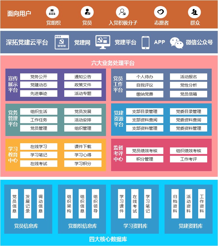 智慧黨建平臺包括“1云4庫6平臺”,一云指的是智慧黨建云,4庫分別是黨員信息庫、黨組織信息庫、學習資料庫、黨建資料庫,6平臺分別是:黨建宣傳平臺、黨員學習平臺、黨員工作平臺、黨務管理平臺、監督考評平臺、黨建資源平臺。
